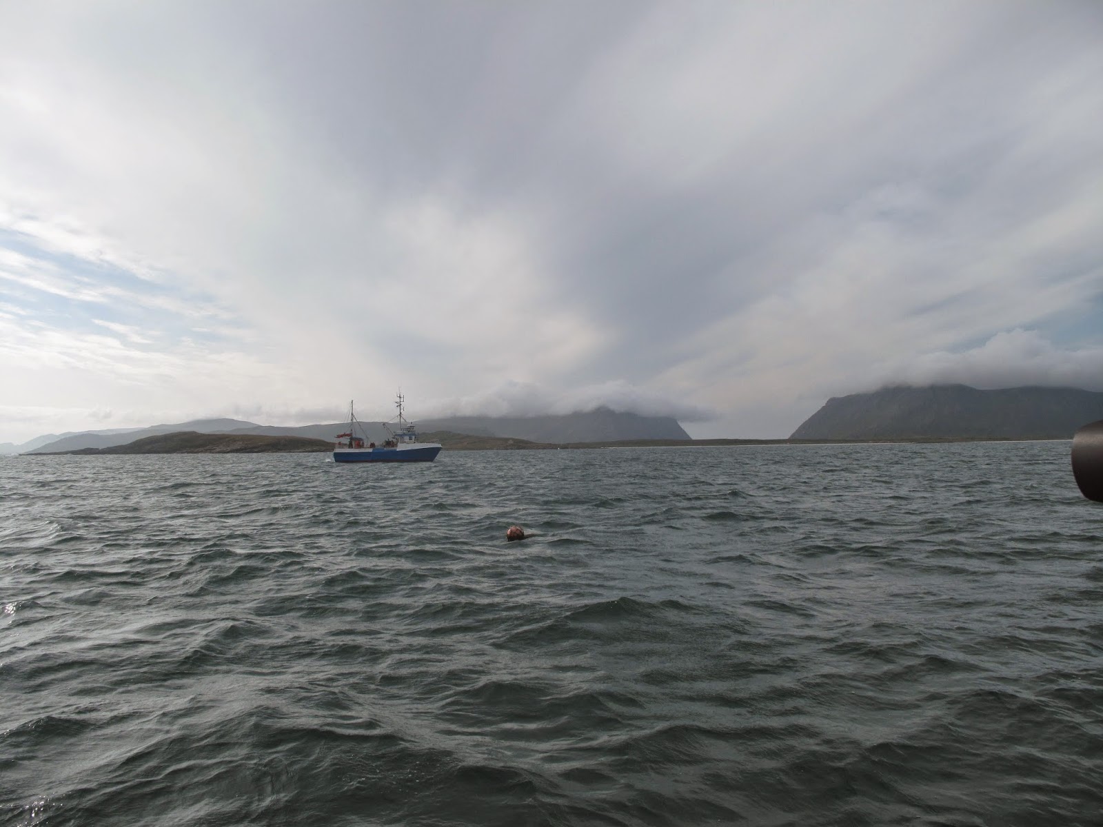 Once finished, we decided to take advantage of our location and do what I always say I will but never do: go fishing after work. Turns out I should do more work in the Norwegian Arctic…and befriend Dimitri with whatever bribes possible. After trying a few spots to come up with dinner/save a couple bucks for the rest of the week, we moved to the open ocean on the west side of Ingoya. The channel in between was amazing with gorgeous cliff views, the sun peaking through clouds, and fjords abundant at our backs.