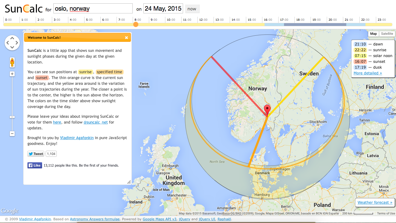 The explanation for how the map’s solar depiction works is in all the screenshots and I really appreciate the permission from Vladimir Agafonkin to let me use his site in this blog. Basically, in all the views you see a shaded band of the sun’s apparent movement in the sky throughout the year. Always in the south for those of us in the Northern Hemisphere with two major variations: