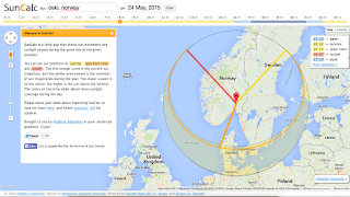 C. In Maine, we all know the saying about what to do if you don’t like the weather. In the Arctic, if you don’t like the sun, wait a few months and it will soon not be a problem, or visible at all for that matter. For now though, it will be out (all the time) once we hit Tromso. To best understand what is happening with the earth-sun geometry I’ve included a few screenshots that show what happens to the sunrise/sunset as you move more northward this time of year.